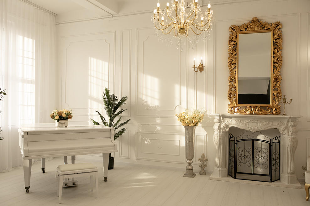Kellékek: Fehér zongora, antik hatású óriás kandalló, baldachines ágy.